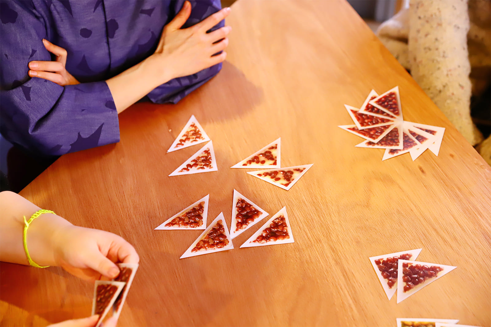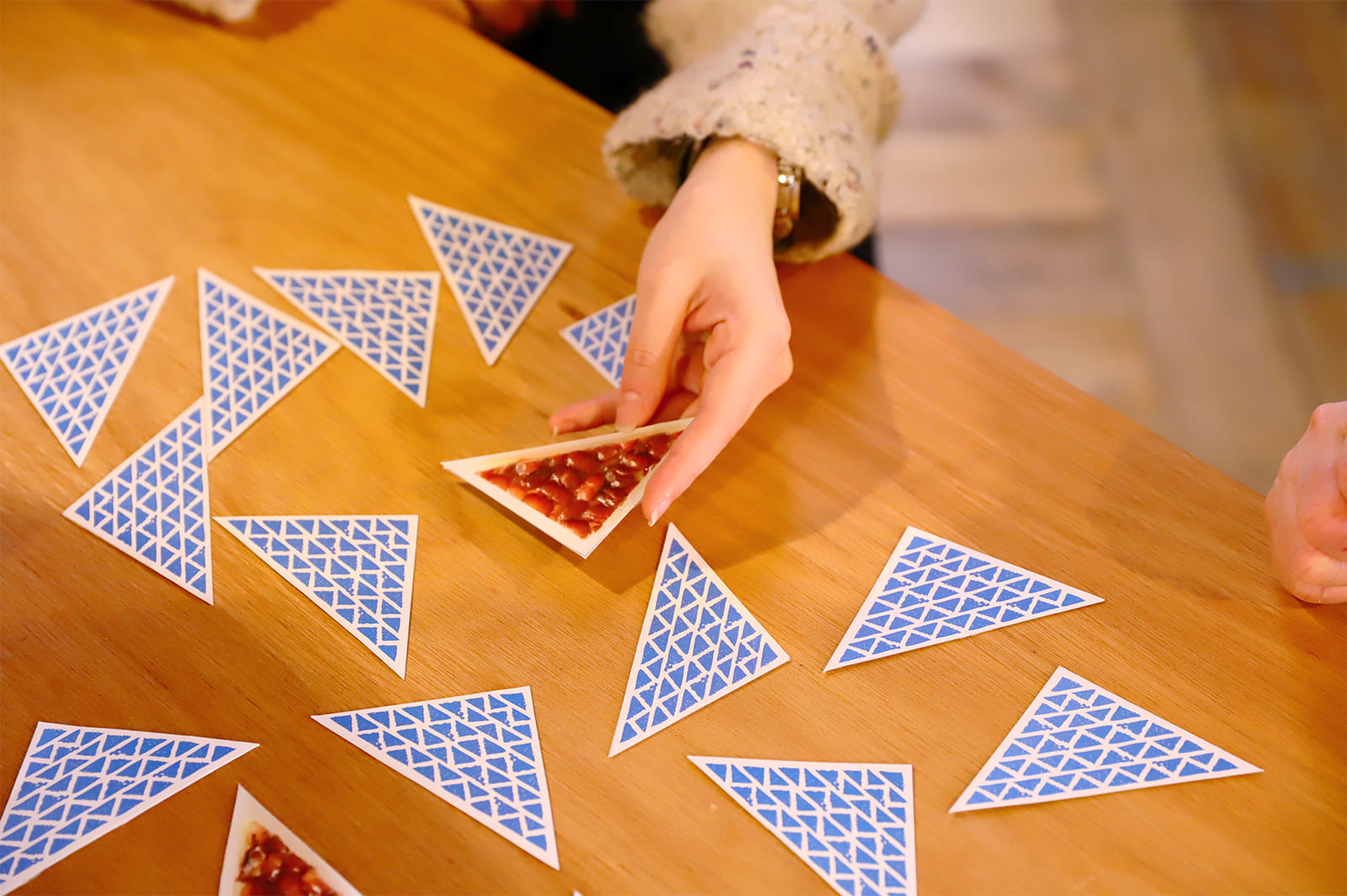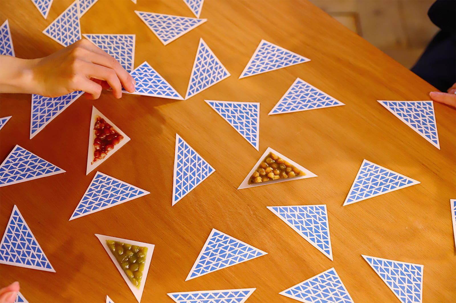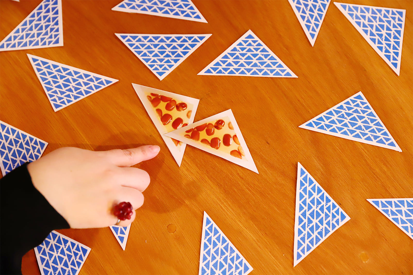 水無月がプリントされた三角形のカードが全部で44ペア。豆の微妙な色や形、大きさを見極めてペアを揃えるのだが、素人目にはすべてほぼ同じに見えるというこのゲーム。つくってしまったからにはやるしかないので、ここからは水無月神経衰弱に奮闘する様子をお届けします。