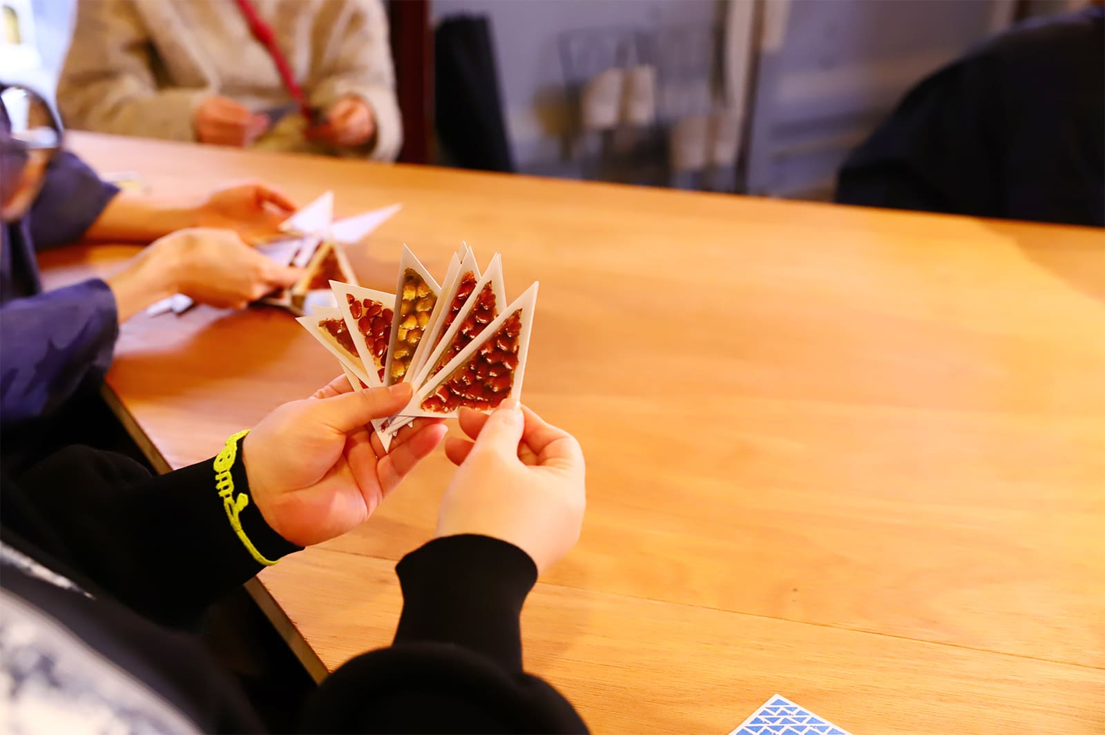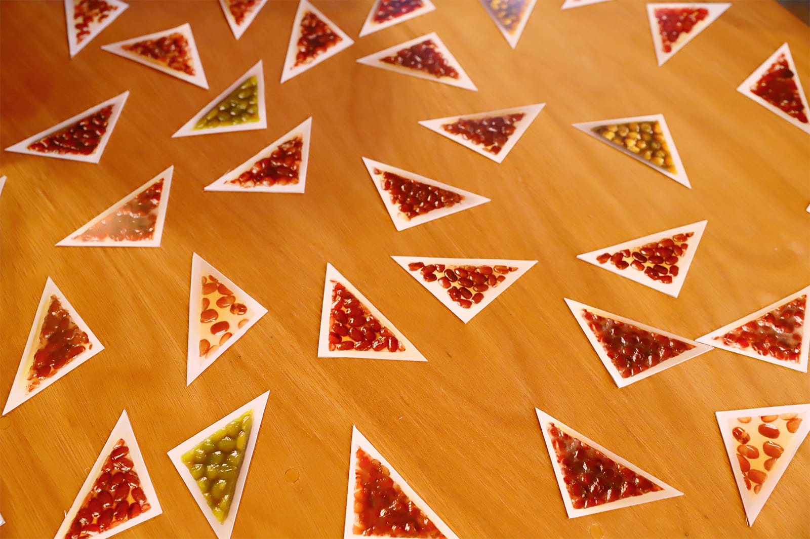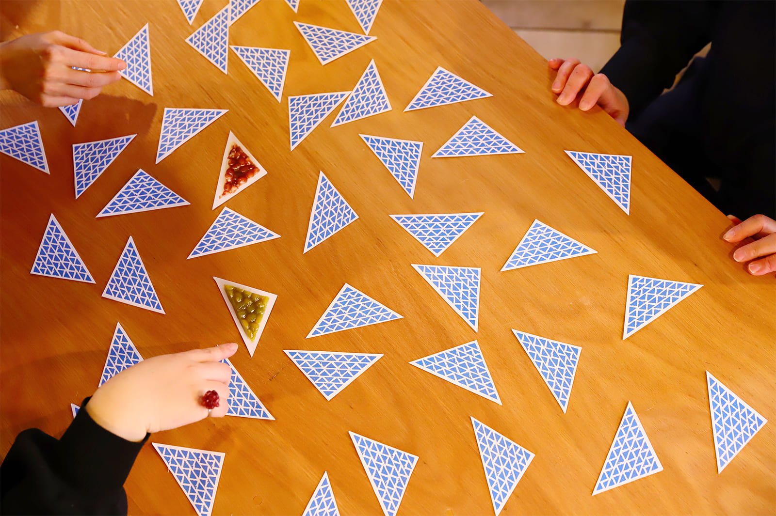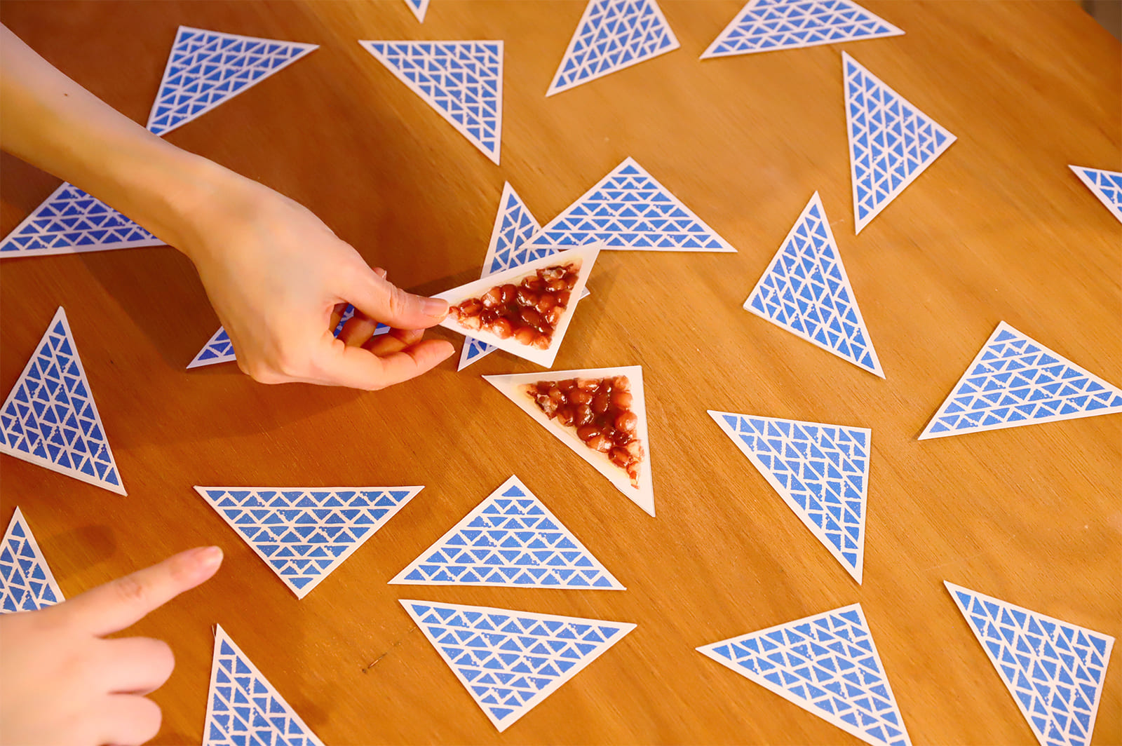 水無月がプリントされた三角形のカードが全部で44ペア。豆の微妙な色や形、大きさを見極めてペアを揃えるのだが、素人目にはすべてほぼ同じに見えるというこのゲーム。つくってしまったからにはやるしかないので、ここからは水無月神経衰弱に奮闘する様子をお届けします。