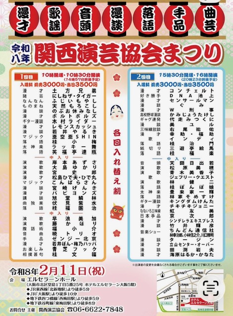 2月11日、大阪は堂島にあるエルセラーンホールに「令和八年 関西演芸協会まつり」を観に行った。