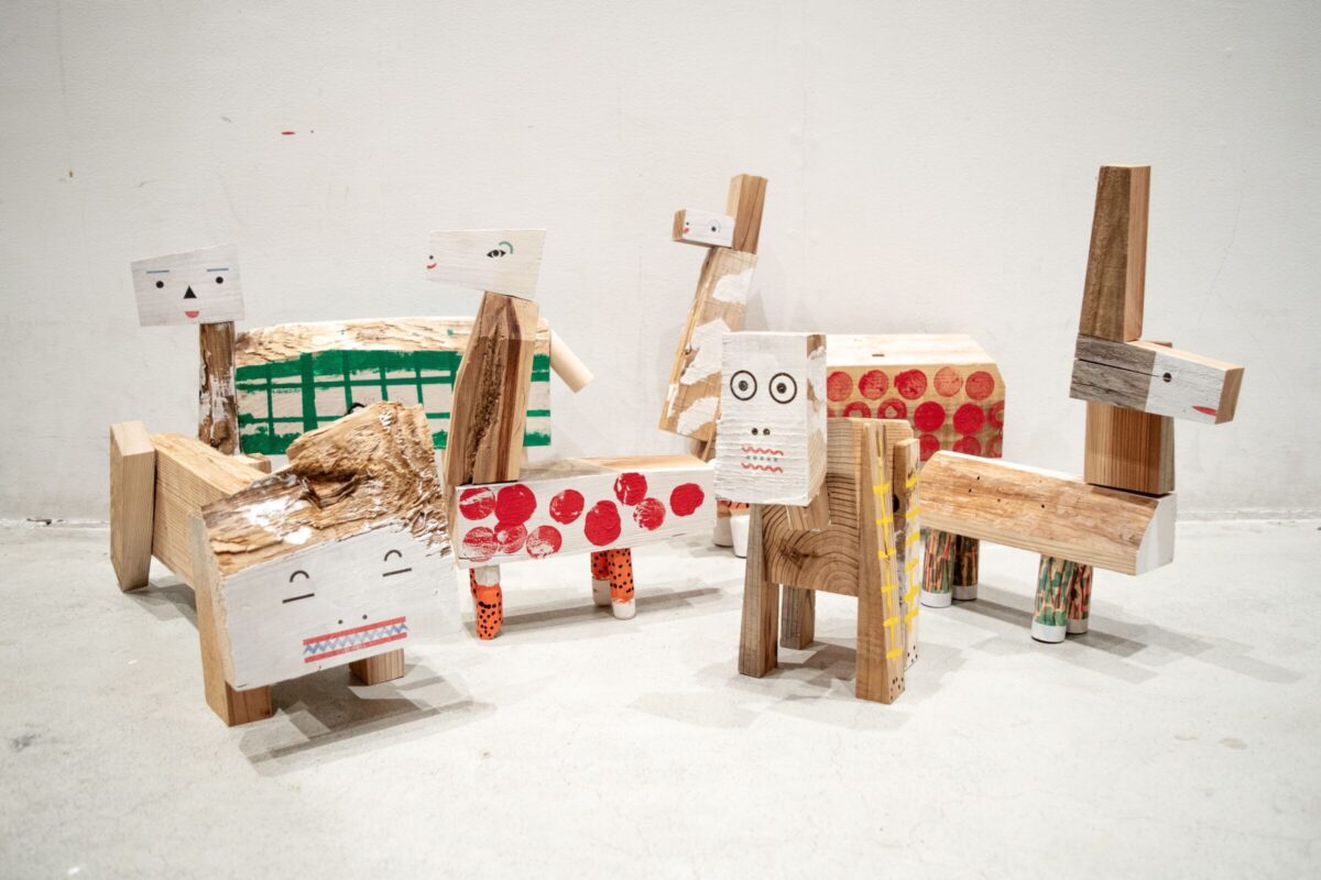 Good Job! センター香芝で作られるコッパン人形の新作動物シリーズや、軸原と長友で制作した古い積木や傷んだこけしを再利用した試作を並べます。お馴染みの本かぶり人形やコッパン人形もあります。