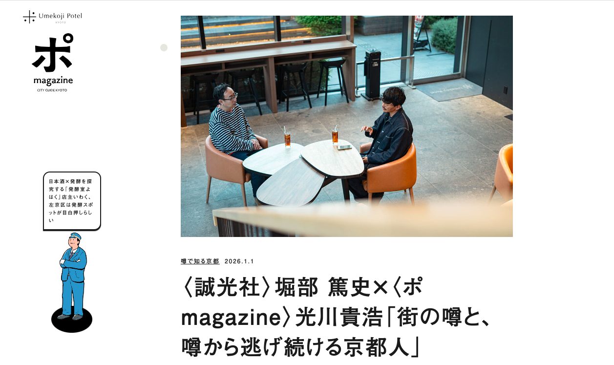 〈誠光社〉堀部 篤史×〈ポmagazine〉光川貴浩「街の噂と、噂から逃げ続ける京都人」 2026年1月4日 ライブラリーの選書、管理でお世話になっております、梅小路ポテルさんのオウンドメディア「ポMAGAZINE」上にて、同ウェブサイトを編集管理する京都の編集ユニット〈バンクトゥ〉の光川貴浩さんとの対談記事が掲載されました。 〈バンクトゥ〉さん編集の『京都ビザール』も2026年中に当店より刊行予定。長期にわたり編集作業進行中ですので、どうぞお楽しみに。